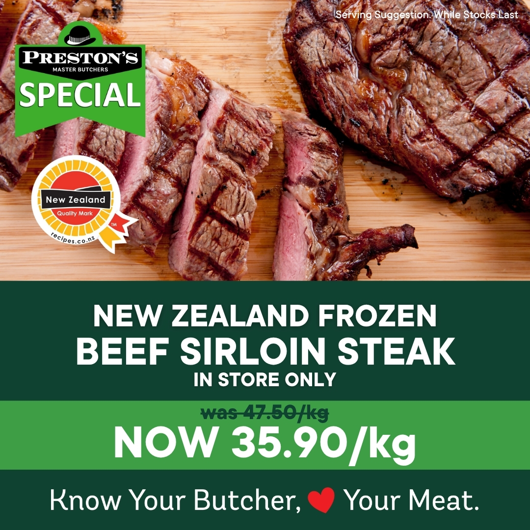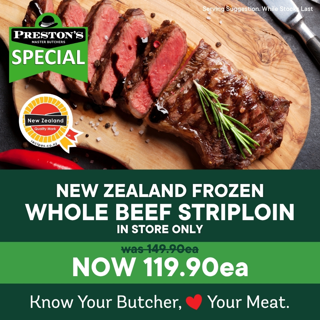 *Whole Striploin and Sirloin Steak available in store only. Delivery area Wellington to Pukerua Bay, including Lower Hutt and Upper Hutt. Free delivery on orders of $200 or more. Delivery date must be before 16 November to receive product at special prices.
