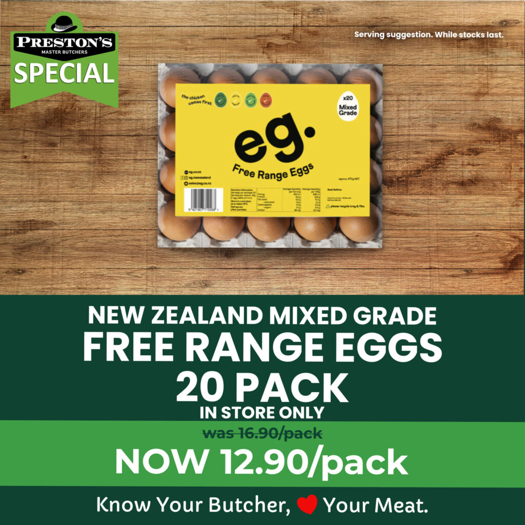 Supporting local New Zealand farmers isn’t just about great tasting meat. At Preston’s, we’re proud to stock eg. Free Range eggs, laid by hens raised in an environment designed for their wellbeing. The result = eggs with strong shells, thick whites, and rich, vibrant yolks.